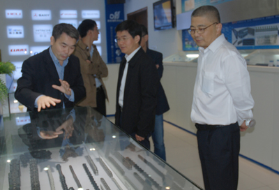 袁副總陪同劉副市長一行參觀了集團公司新區樣品展廳,向劉副市長一行介紹了世界鏈條發展史、中國鏈條發展史和東華鏈條集團發展史及公司所獲得的各類重要榮譽,重點介紹了展廳中傳動鏈、輸送鏈、板式鏈、工程鏈、扶梯鏈等各種精品鏈條的研發、制造和配套客戶。劉副市長一行紛紛提問或點頭稱贊表示認可。