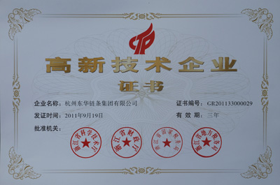 東華集團與下屬自強公司于2011年9月分兩批先后根據《高新技術企業認定管理辦法》和《高新技術企業認定管理工作指引》有關規定,經地方認定工作辦公室初審和專家評審等程序,對企業的經營業績、科研投入比例、高新產品、研發組織管理水平、核心自主知識產權、科技成果轉化能力及科技人員比例、財務成長性等指標進行了全面、嚴格的考察,東華集團和自強公司各項業績指標均達到國家級“高新技術企業”的要求,順利通過審核。2012年4月份正式獲得由浙江省科學技術廳、浙江省財政廳、浙江省國家稅務局、浙江省地方稅務局聯合頒發的國家級“高新技術企業”認定證書,有效期三年。