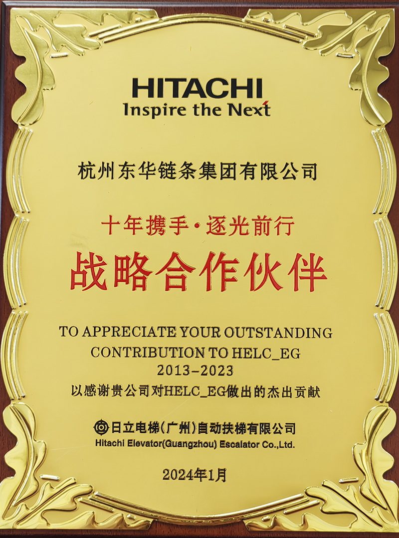 日立電梯(廣州)自動(dòng)扶梯有限公司是東華的重點(diǎn)配套主機(jī)客戶,其配套產(chǎn)品涵蓋商用梯、公交梯,雙方在多年的合作中已建立了良好的合作基礎(chǔ)。2023年,扶梯工程鏈?zhǔn)聵I(yè)部積極實(shí)施細(xì)分市場(chǎng)冠軍戰(zhàn)略,堅(jiān)持專業(yè)化、系統(tǒng)化、高端化和高質(zhì)量發(fā)展的定位,不斷開(kāi)發(fā)和滿足日立電梯的需求,積極走訪市場(chǎng),在產(chǎn)品制造過(guò)程中嚴(yán)控工藝、提升交付率,在產(chǎn)品質(zhì)量上更是精益求精,全方位提升服務(wù)。此次東華獲得2023年度突出貢獻(xiàn)獎(jiǎng)和戰(zhàn)略合作伙伴獎(jiǎng)是日立電梯(廣州)自動(dòng)扶梯有限公司對(duì)東華扶梯鏈產(chǎn)品質(zhì)量的高度肯定,也讓我們對(duì)2024年服務(wù)好客戶信心倍增。